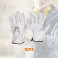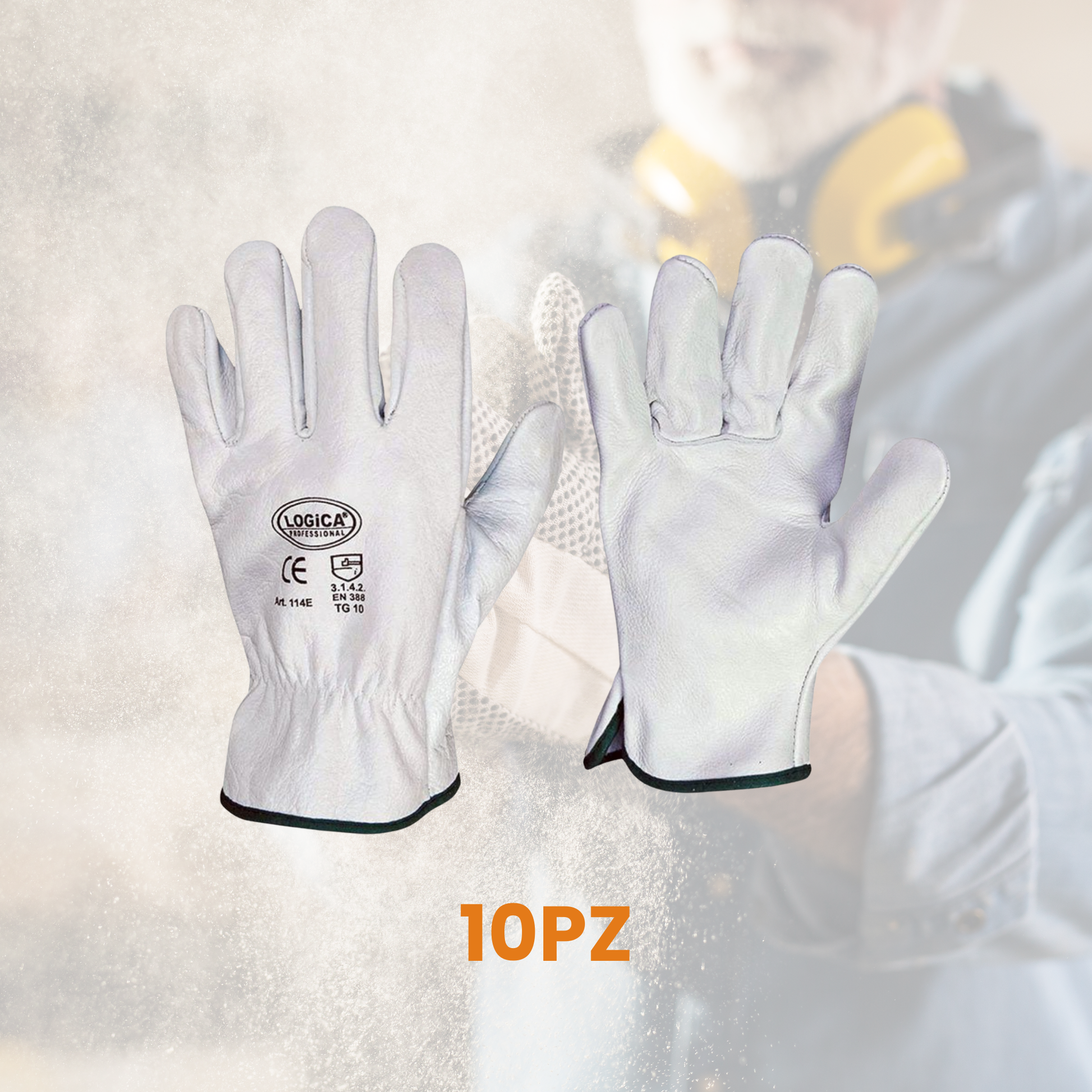 Guanto realizzato in pelle fiore bovino bianca, con bordo rinforzato e polsino elastico stringipolso. Conforme alla normativa EN388 (4143X).